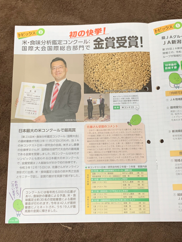 JA越後ながおかの広報誌にて 投稿者:suyosinouzi2021年12月31日カテゴリー:未分類 令和3年(2021)12月30日 JA越後ながおかの広報誌「e-na:2022年1月号」にて、米・食味分析鑑定コンクール:国際大会にて金賞を受賞した旨を掲載していただきました。 共有: X で共有 (新しいウィンドウで開きます) X Facebook で共有 (新しいウィンドウで開きます) Facebook いいね 読み込み中… 関連