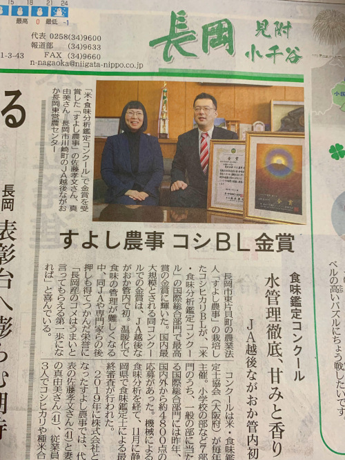新潟日報にて 投稿者:suyosinouzi2022年2月6日カテゴリー:未分類 令和4年2月5日(土)の新潟日報20面にて、「第 23回 米・食味分析鑑定コンクール国際大会 in 富士山」の受賞を記事にしていただきました。 共有: X で共有 (新しいウィンドウで開きます) X Facebook で共有 (新しいウィンドウで開きます) Facebook いいね 読み込み中… 関連