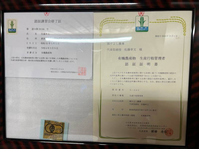 春から継続して勉強し申請を行ってきたJAS有機栽培について、認定をいただきました。